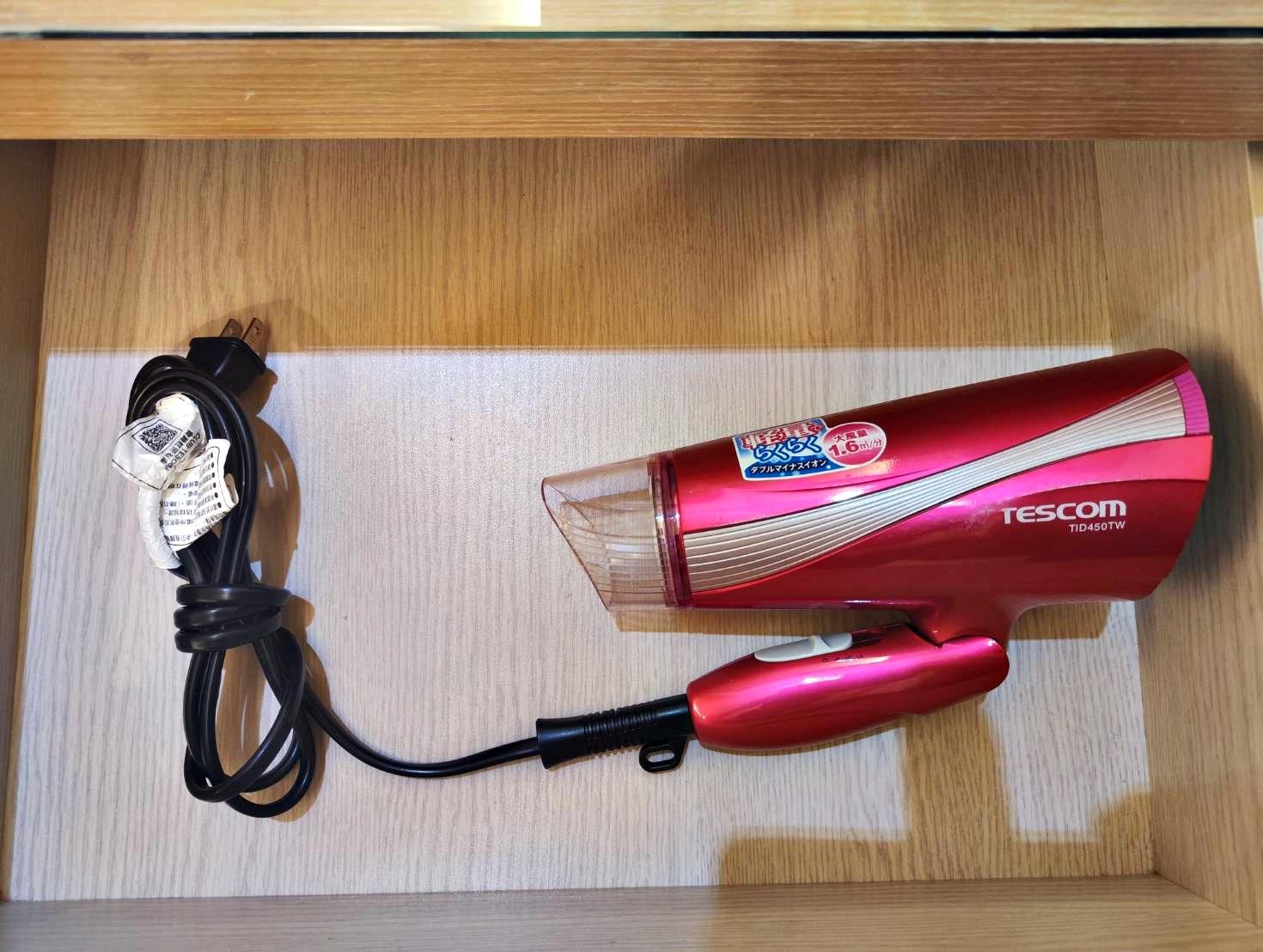 5、大小毛巾組放置於洗手台右側及掛於浴室扶手,摺疊吹風機則置於書桌右側抽屜(依現場提供為準)。