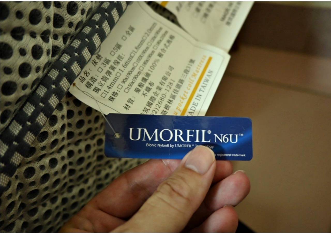 1、床墊由外層至內層依序為「UMORFIL膠原蛋白自然消臭舒柔布」、「32高密度泡棉」、「防潮TT布」、「斯里蘭卡5CM天然乳膠」、「防潮TT布」、「高密度泡棉與硬質棉」、「中鋼鋼線含碳量77b、七圈設計的高彈力獨立筒彈簧」、「泡棉護邊」、「硬質棉」、「防潮TT布」、「舒適纖維棉與舒柔布」等多層材質組成。